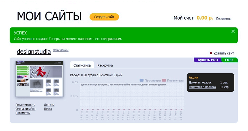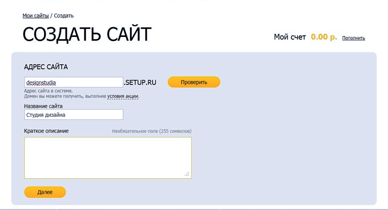 3. Нажимаете кнопку «Создать сайт» и выбираете для него домен