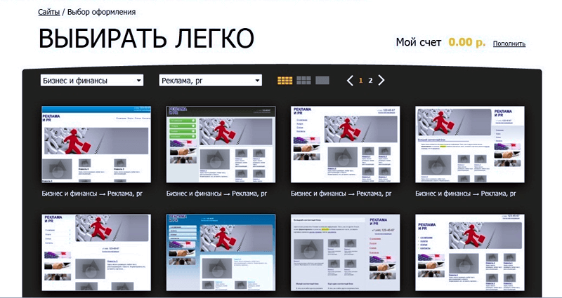 4. Выбираем дизайн сайта: в соответствующих окошках укажите тип (Бизнес и финансы) и категорию (Реклама, PR) будущего ресурса — и определяйте, какой шаблон вам больше подходит.