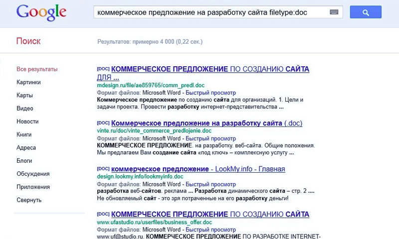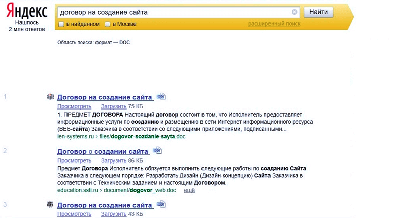 Еще один важный шаг в «упаковке» продукта — подготовка коммерческих предложений и договоров. Рекомендуем поступить следующим образом: настройте расширенный поиск Яндекса или Google только по doc-документам. Ищите фразы: «договор на создание сайта», «коммерческое предложение на разработку сайта».