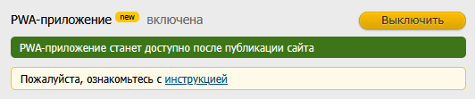 Для включения PWA-приложения войдите в параметры Вашего сайта и нажмите на кнопку "Включить" и переопубликуйте сайт.